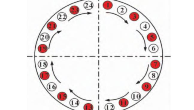 如上圖24路螺栓法蘭50%螺栓拉伸器覆蓋編號圖我們可以看出,螺栓依然是依次編號,只不過在安裝螺栓拉伸器時(shí)是總數(shù)分為兩組,隔一顆安裝,總體覆蓋便可以達(dá)到50%也就是12顆。安裝好之后按步驟拉伸即可。如此可知,24路螺栓法蘭25%的螺栓覆蓋需要做到6同步編號,也就是6組4個(gè)號,先均分為6個(gè)點(diǎn)標(biāo)“1”,再取間隔之中為“2”,依次取中編“3”,編“4”,編完即可。拉伸時(shí)按照編號分次拉伸。